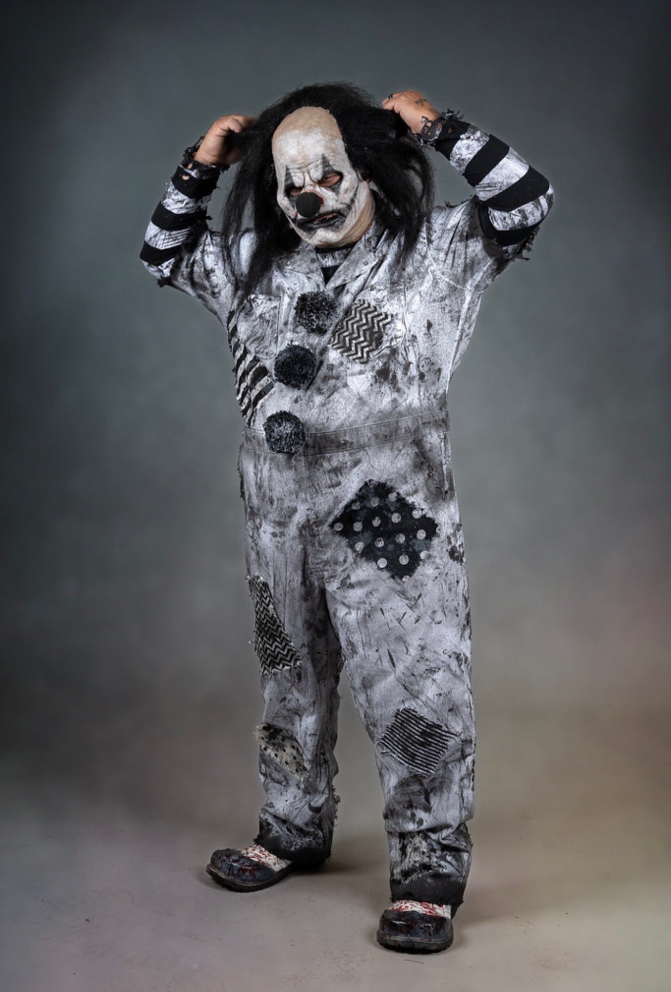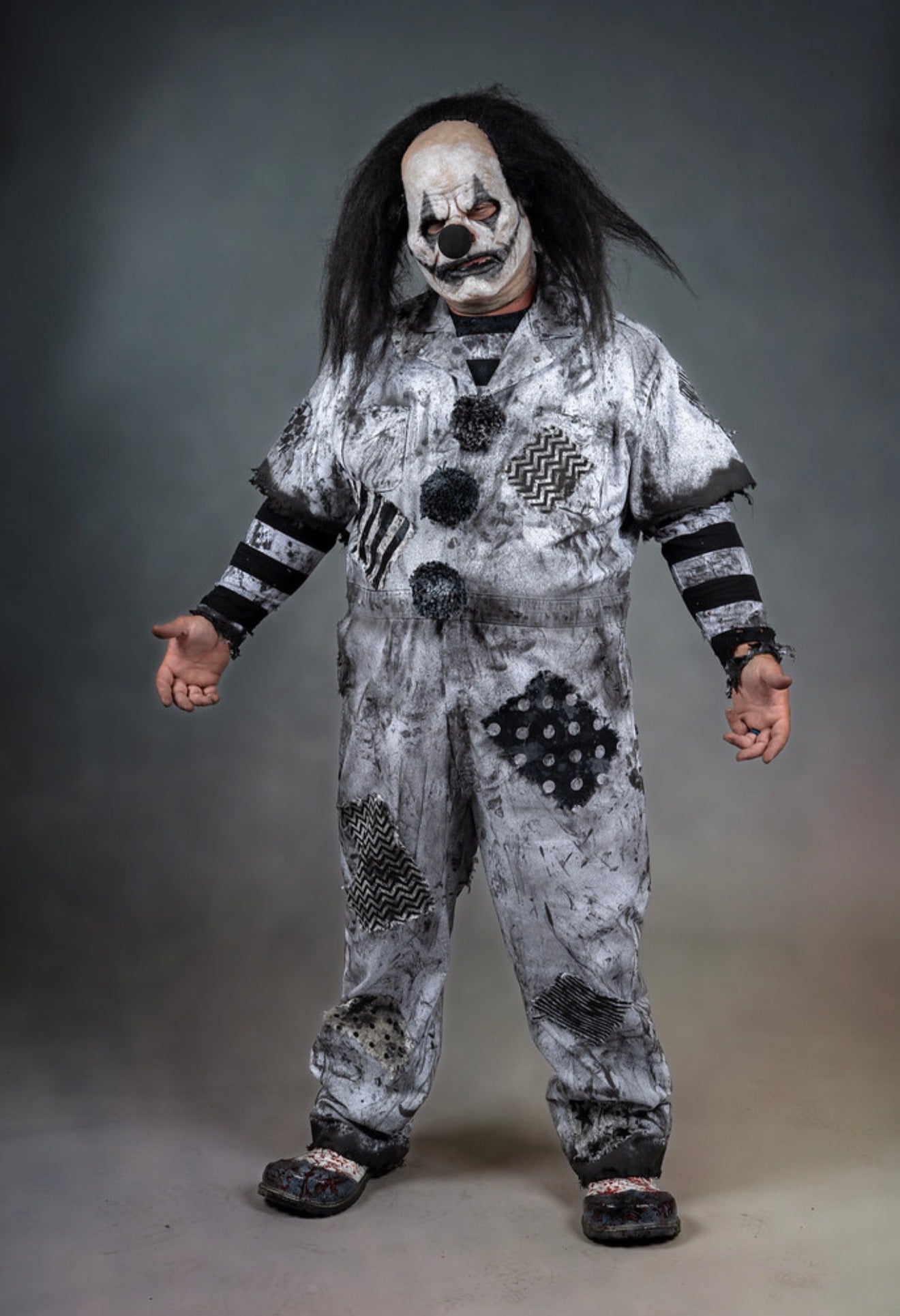 Costume ranges from small to XXXL. Comes complete with coveralls with patches and under shirt! Shoes not included